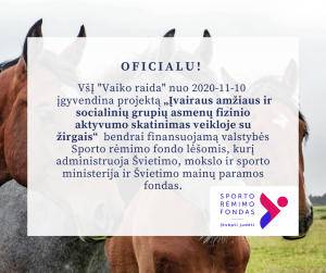 „Projektas „Įvairaus amžiaus ir socialinių grupių asmenų fizinio aktyvumo skatinimas veikloje su žirgais“ bendrai finansuojamas valstybės Sporto rėmimo fondo lėšomis, kurį administruoja Švietimo, mokslo ir sporto ministerija ir Švietimo mainų paramos fondas.“
